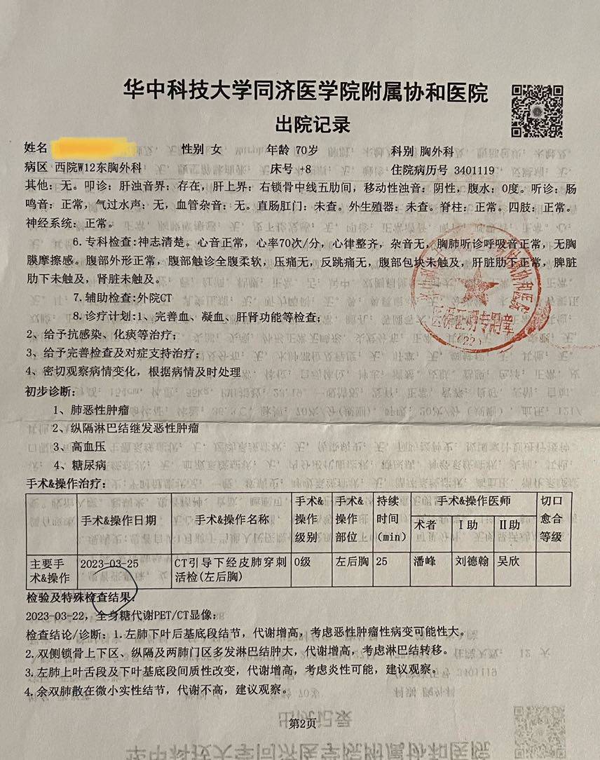 2023年3月15日,妈妈入住华中科技大学同济医学院附属协和医院西院区胸外科,准备由江医生手术。但是,术前检查发现,纵隔淋巴结转移!从这一刻开始,我的天塌了!!!我和医生商量,先不告诉我妈真实情况,只说年纪太大,先保守治疗不手术。自此,我每天都背着我妈哭哭哭……3月22日,pet结果出来,纵隔、淋巴结、锁骨转移,最后一点希望破灭了……3月25日,穿刺活检……