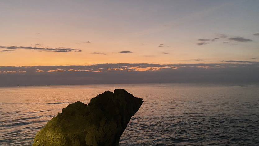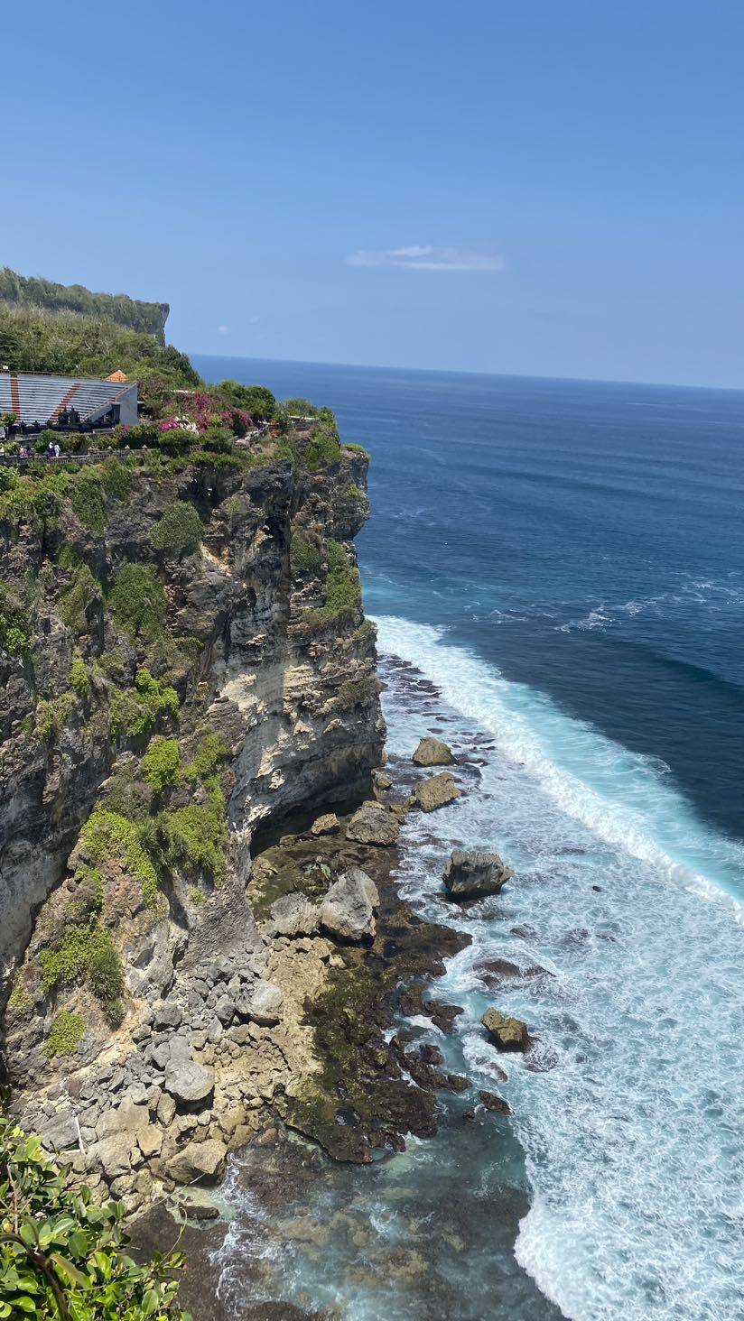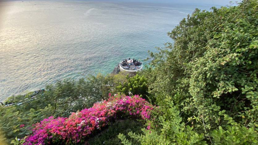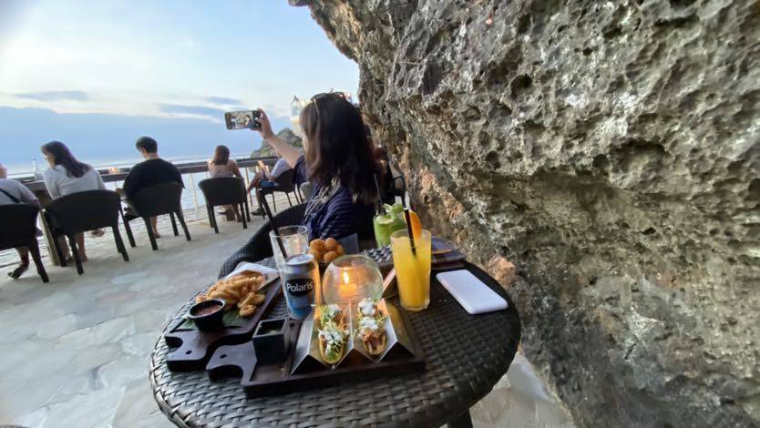 言归正传,在巴厘岛的最后一天,是晚上十二点半的飞机,还有整个白天可以安排,约司机十一点来接,终于可以多睡会了,九点多在酒店吃了自助早餐就出发,只安排了两个松散的行程,中午去了海边情人崖,景色虽美,比起前两天的海湾逊色很多,加之审美疲劳,身体疲劳,稍微逛了一下就走了,第二个行程是去岩石酒吧看日落,时间还早就去了库塔的商场逛,也没啥可逛的,坐下点冷饮休息,六点钟到了Rock Bar,继续点冷饮,各种吃的坐在海边的岩石酒吧看日落,云层太厚,只有夕阳。八点出发去机场,把兜里的印尼盾全数用完,买了两瓶网红现榨果汁,好看不好喝,用料太杂了,托运行李,安检入关,准点登机,准点到达广州,美女要我们在广州她家休整几天再回去,这次带我们旅行,她不仅全程制定计划,全程翻译陪同,每天坐在车上都在上班,晚上入住酒店还要工作到凌晨两三点,实在是辛苦,刚刚一下飞机就开始工作了,我们决定马上买机票回武汉。在白云机场登机口附近看见了重庆小面,每人一大碗肥肠面,好吃惨了,回家起码一星期看啥都好吃。
