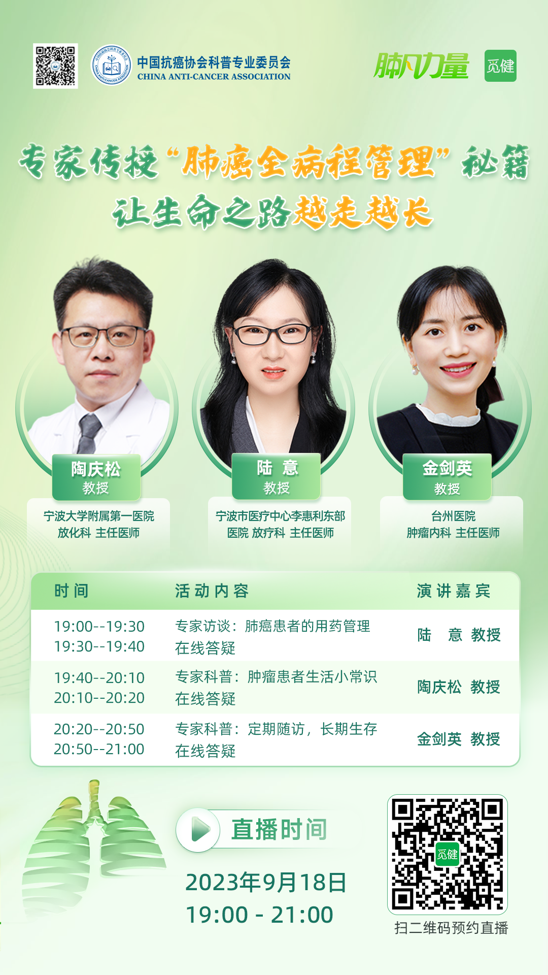 在本次直播中,陆意教授将为觅友们详细探讨肺癌患者的用药管理陶庆松教授将和大家一起讨论肿瘤患者生活小常识金剑英教授将为大家带来如何做到定期随访,长期生存的详细讲解。