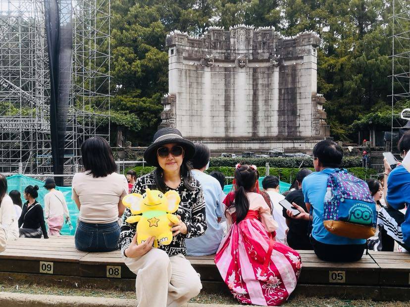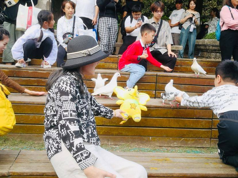踏着午后的阳光,带上觅吉来到了中山陵音乐台,建于1932年—1933年的音乐台,是为了纪念孙中山先生的,中西合璧的建筑风格,由关颂声、杨廷宝设计,进入音乐台前先让觅吉来个合影,音乐台景区里,游人如织,一群工人正在拆卸舞台装置,这是因为国庆之夜,音乐台举办了南京森林音乐会,但不影响觅吉的游玩,你看觅吉和鸽子亲密互动呢,可爱不可爱,翩翩起舞的白鸽展翅翱翔,是一个让人放松心情的好地方,我和觅吉度过了一个愉快的下午时光。