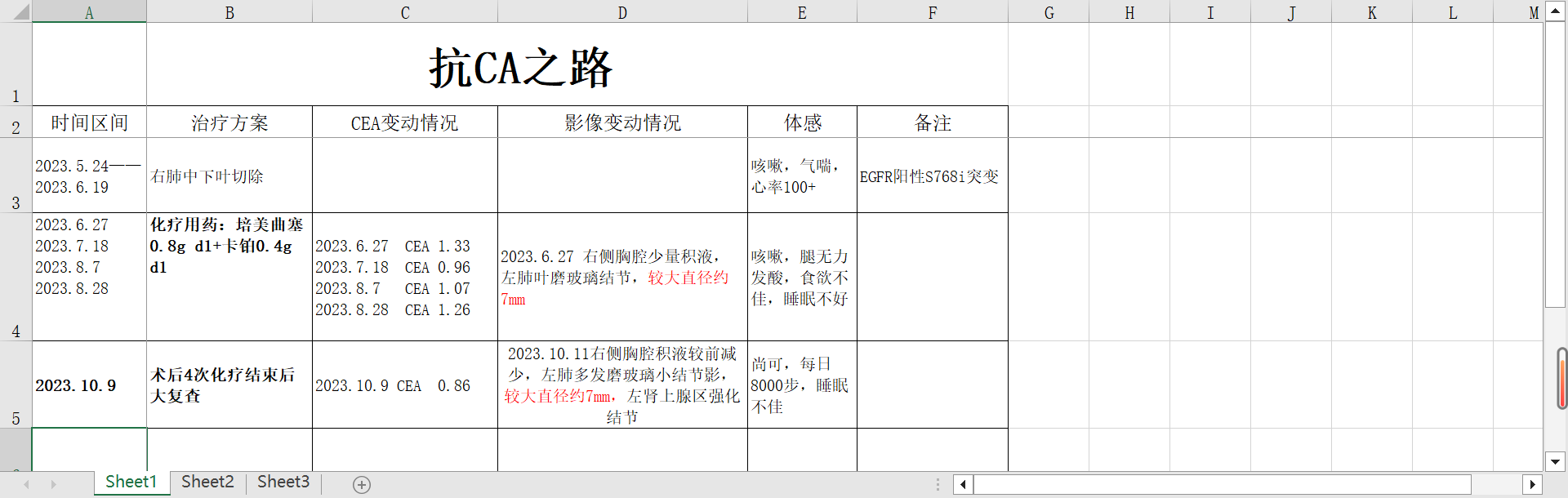 妈妈最后一次化疗的时间是8.28,关于化疗后的治疗主治医生和主任都是按照指南让随访定期复查。十一节后妈妈入院做了个大检查,从头到肩颈再到胸部、腹部做的是增强CT,因为刚化疗一个月各项抽血指标和CT都没有异常。主治医生还是不建议吃阿法,还让我问了科室的2个主任,在问之前我都知道主任大概率也是按照指南让随访,其中一个主任还问了我们的免疫表达我说有80%的,主任说可以做一年免疫。在这之前有了解过有靶点和免疫表达的还是走靶向药这条路。中期的吃靶向药更好,如果晚期会容易耐药,如果吃药还复发可能得换免疫方向。