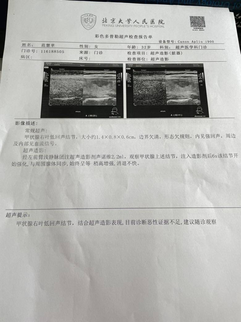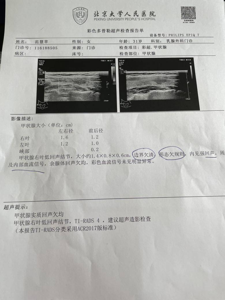 最近感冒了十多天,喉咙也是一直不舒服,在上次开药的时候就开了甲状腺B超,今天来看中医,正好一起,甲状腺我没有单独查过,原来都是查ct顺带,这次查甲状腺直接给我当头一棒,先做的普通B超,医生给的结果是4类,让做超声介入,我看到报告后全身都感觉抖,眼泪就是马上要冒出来,思索了一下赶紧去超声介入室看看今天能不能做,去了医生一看报告,让我躺下在检查了一下说我给你开单子,你去缴费,然后进一步加强检查,问了病史,我缴费完,填表格,签子,然后开始检查,左侧胳膊埋针注入药物,检查完等结果,感觉我脸都是苍白的,过了一会医生把报告给了我,说看着问题不大,定期检查,我才松口气,但是感觉还是不放心,想着约个甲状腺科的在看看怎么说