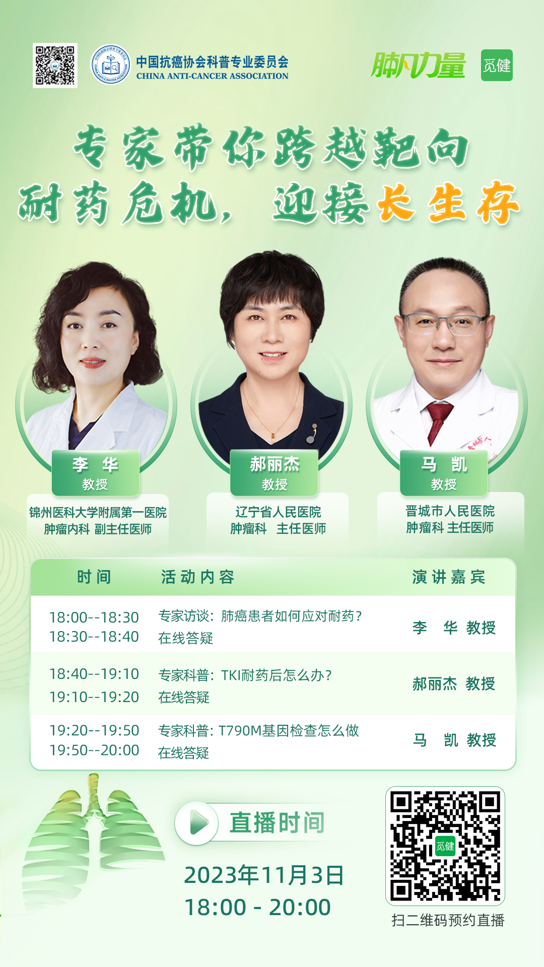 正值11月“国际肺癌关注月”,为了给更多的患者及家属解答疑惑,协助觅友们做好全病程管理,在中国抗癌协会科普专业委员会的指导下,觅健肺小凡给觅友们开设了2023年“肺凡力量”肺癌疾病科普教育大型讲座,本次的科普直播主题为「专家带你跨越靶向耐药危机,迎接长生存」。