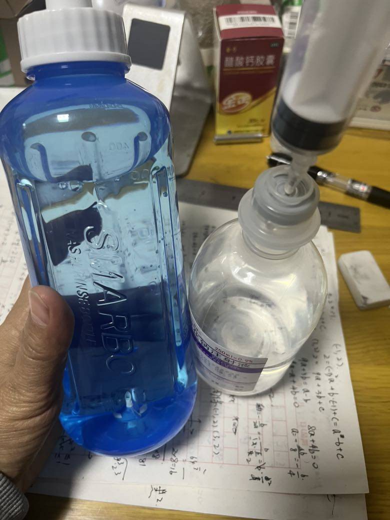 洗鼻壶用来洗鼻腔,大注射器拔下针头,用来冲洗眼睛。生理盐水可以买也可以自己配。