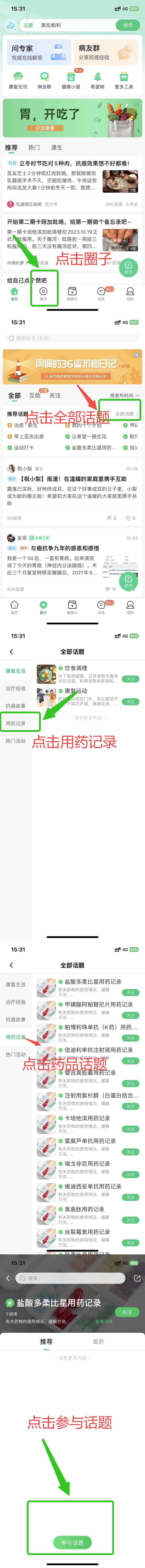 活动开启之后大家可以点击圈子,进入全部话题,点击用药记录自由发帖,为了方便大家更好的分享,这次活动的药品范围和分享时间都没有设限 但大家记得在标题里面带上药品名称哟~