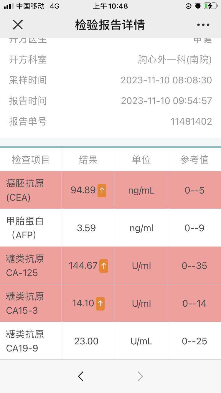 下面是这次的肿瘤指标,挺高的。好在身体没有太大的不适。
