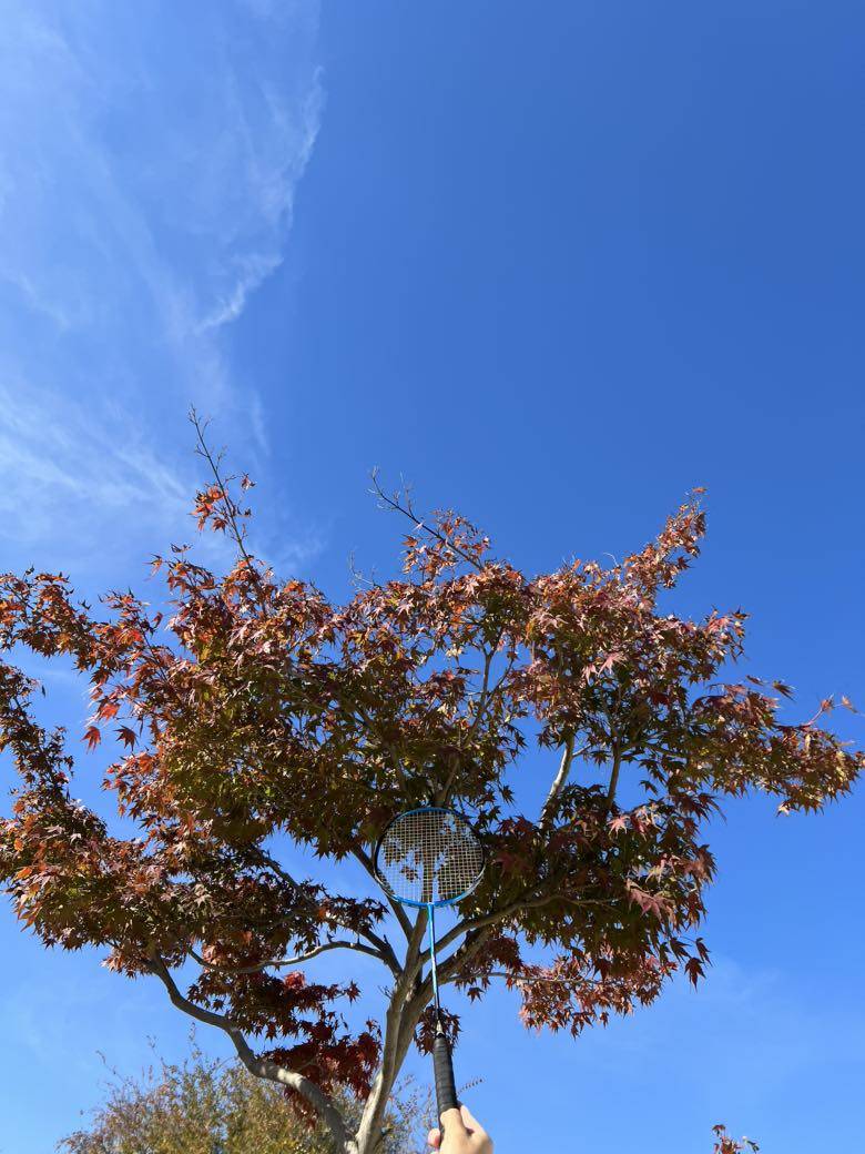 今天太阳暖洋洋而且没有风,出去散步➕打羽毛球,技术太菜打到树上几次,分享蓝蓝天空,🏸挂在红红枫树🍁,捕捉到✈️划过。