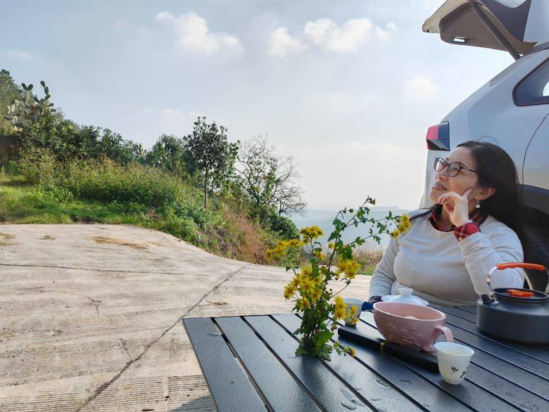 午餐后他们有事回家了,我和老公收拾好东西,又一路向上,找到山峰最高处,烧水煮茶,晒太阳。满山的野菊花,随手摘下插在桌上,黄灿灿的野菊花让拍照的画面顿时生动起来。