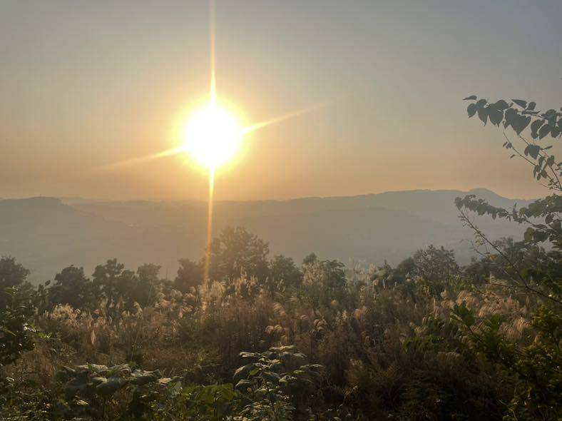 快六点看对面山上夕阳西下,延绵的群山在夕阳的余晖里镀上金边,一山更比一山高,站在山巅有笑傲江湖的感觉。心满意足再摘一大束野菊花抱回家插,又节约一束鲜花钱,好美的心情。