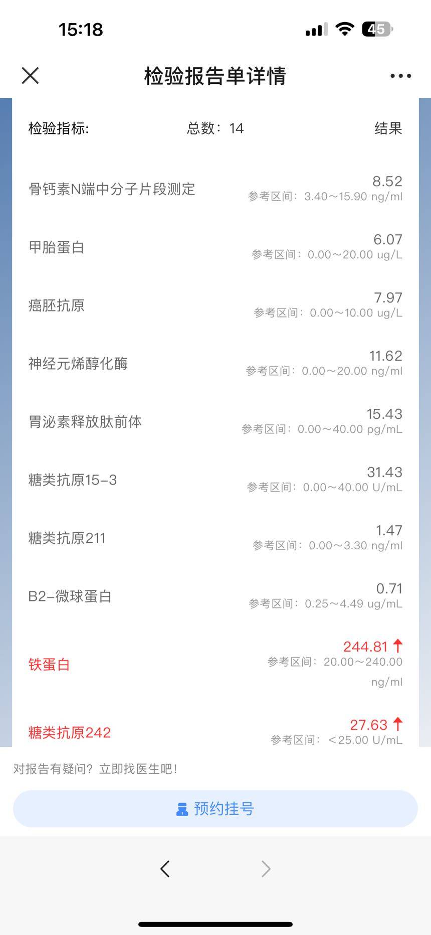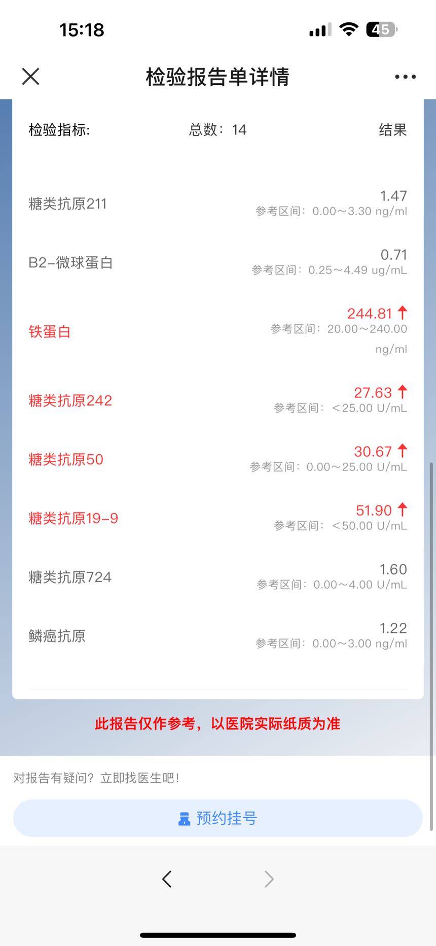 11/27日医生一大早打电话通知入院,急急忙忙整理好东西就去医院了!老公前几天眼睛又肿了,去医院配的醋酸泼尼松和头孢,吃了一天就退了!也不知道是不是免疫引起的反应!但我估计是。入院后和医生交流了一下病人情况,医生看了从开始到最近的Ct片,说病人目前看着效果不错,可能是少数免疫获益的人群!老公听了很开心,但是医生说要注意免疫的副作用,由于我从觅健看到过群友写的文章,知道会有免疫性肺炎肠炎等症状的发生,感谢觅健平台,让我知道了很多事情!老公皮肤瘙痒问题还是有,皮肤也会有脱皮现象,但是对于癌症面前这些都是小事!昨天刚刚看了生化检验,怎么几个指标有点超标了,请问各位你们有这样的问题吗?附图