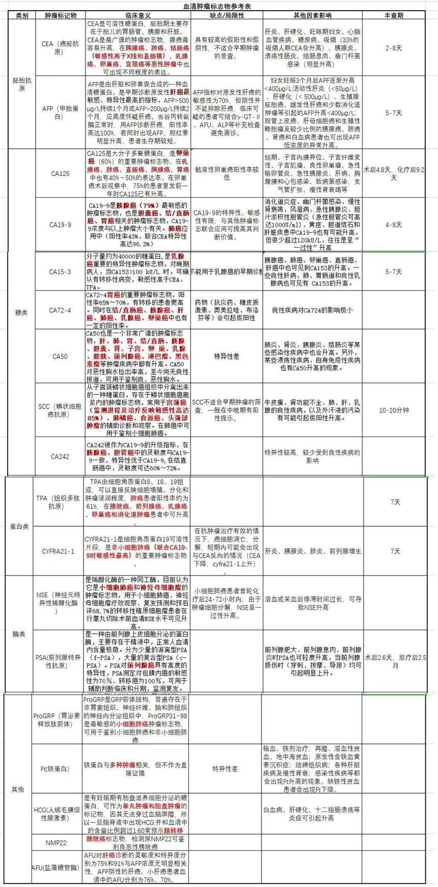 经典肿瘤标记物对照表