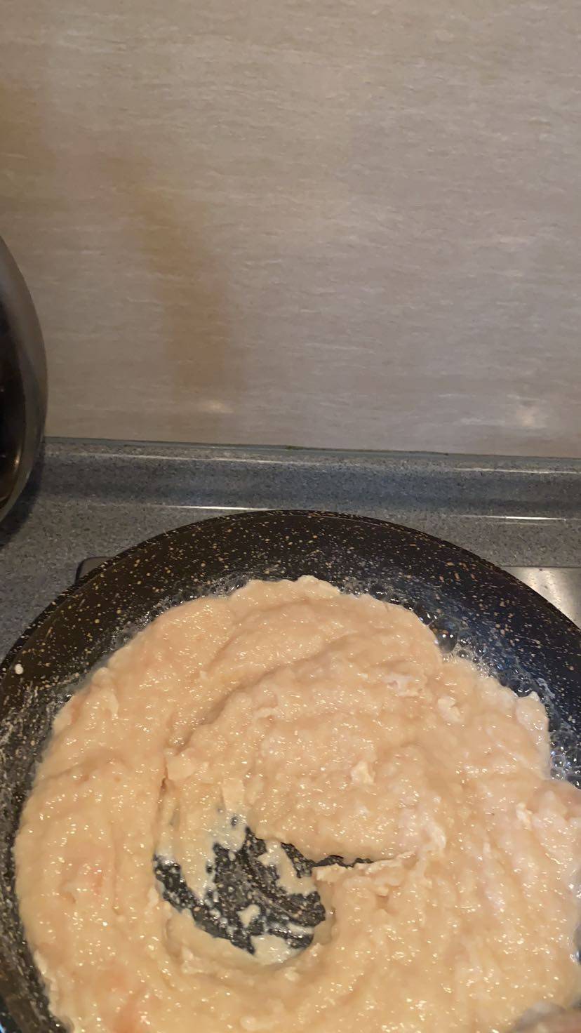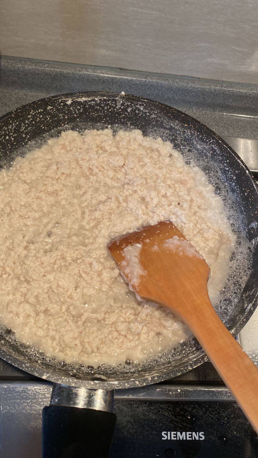 今天用了380g鸡胸肉切丁放入料理机打成浆,加入250g白洋葱切丁继续打成浆,加入100g盐加的少接下来倒入不粘锅炒中小火不停搅拌