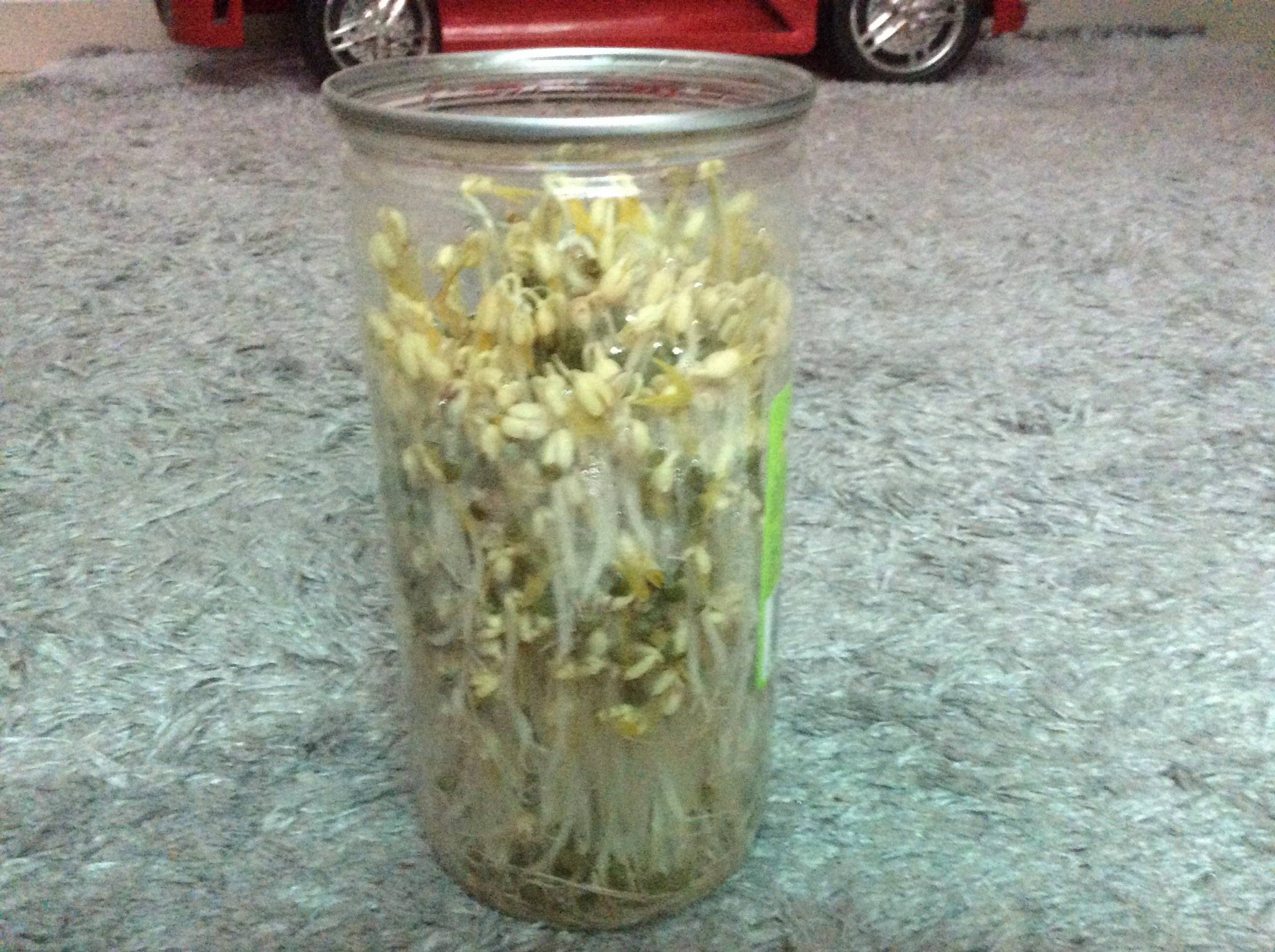 让生活充满希望自己动手埔绿豆芽、哈!5天了己生气勃勃了、今天晚上的素菜是它了
