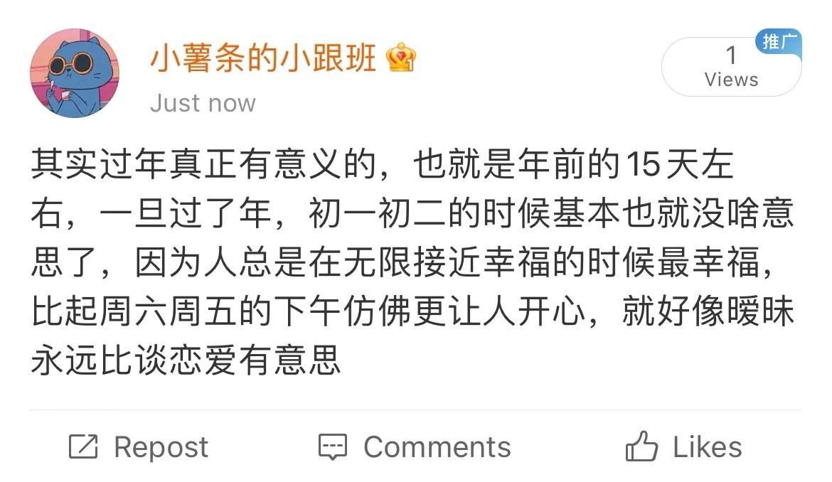 过年真正的意义是在年前5天左右,在过年回家的路上,在和亲人置办年货的时候,一旦过了年,初一初二的时候就没意思了,因为人总是在无限接近辛福的时候最幸福,就像周五的下午永远比周末更快乐,因为期待比拥有更让人开心。