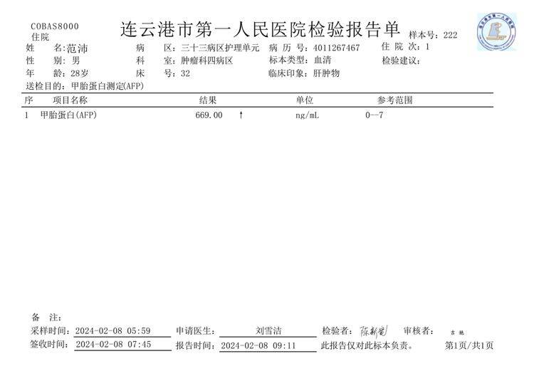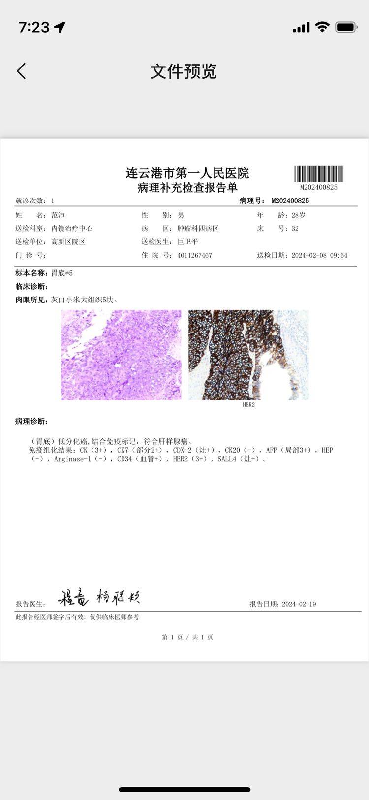 肝样胃癌晚期患者。(低分化肝样性胃癌her-2+++)癌王。恶化速度快,程度高,患者生存周期极短。