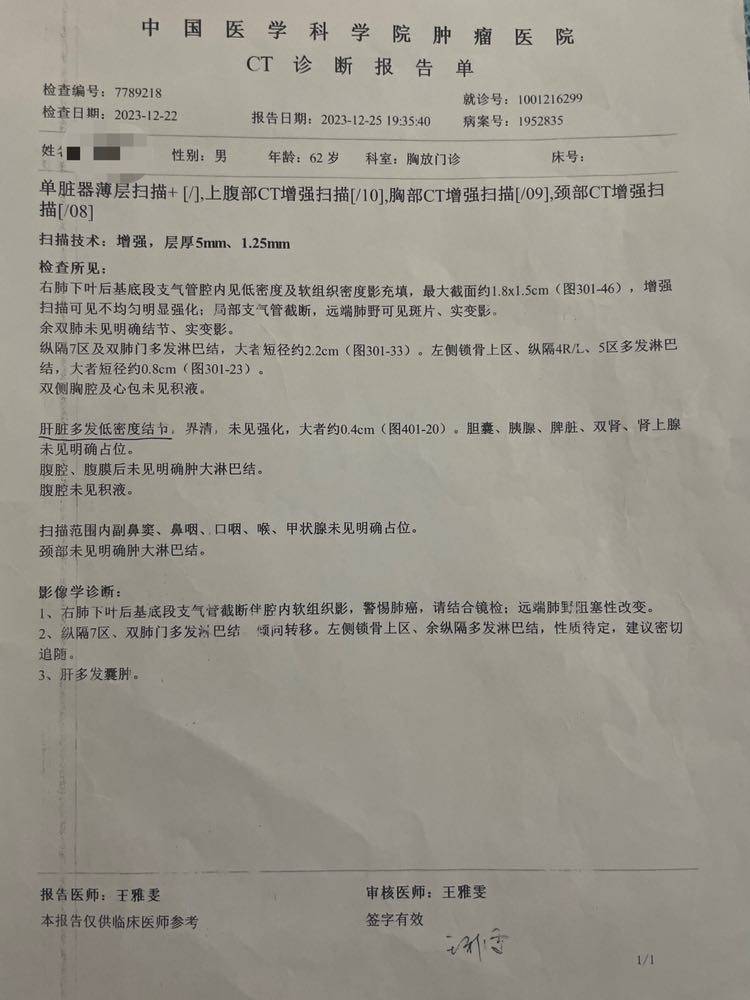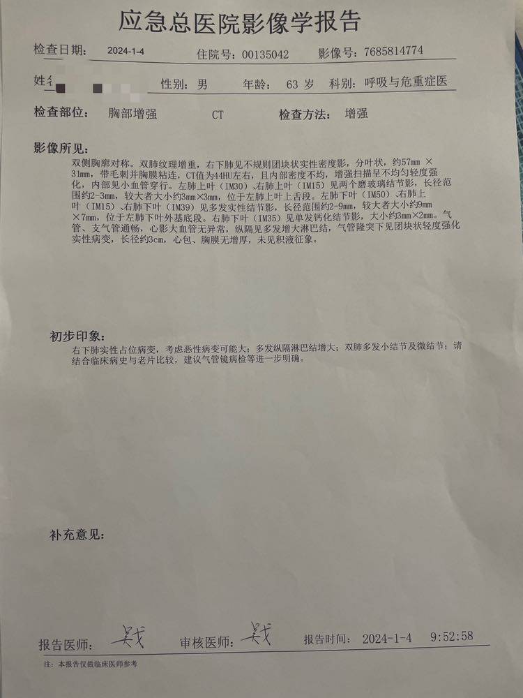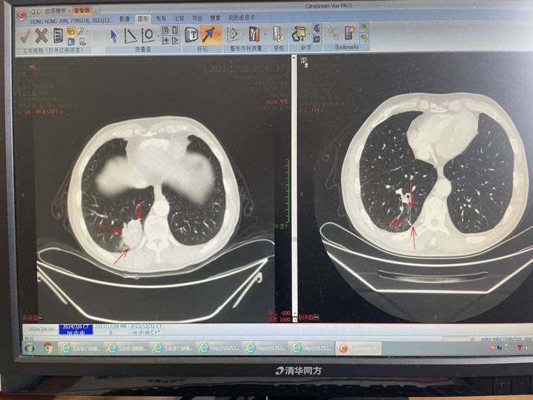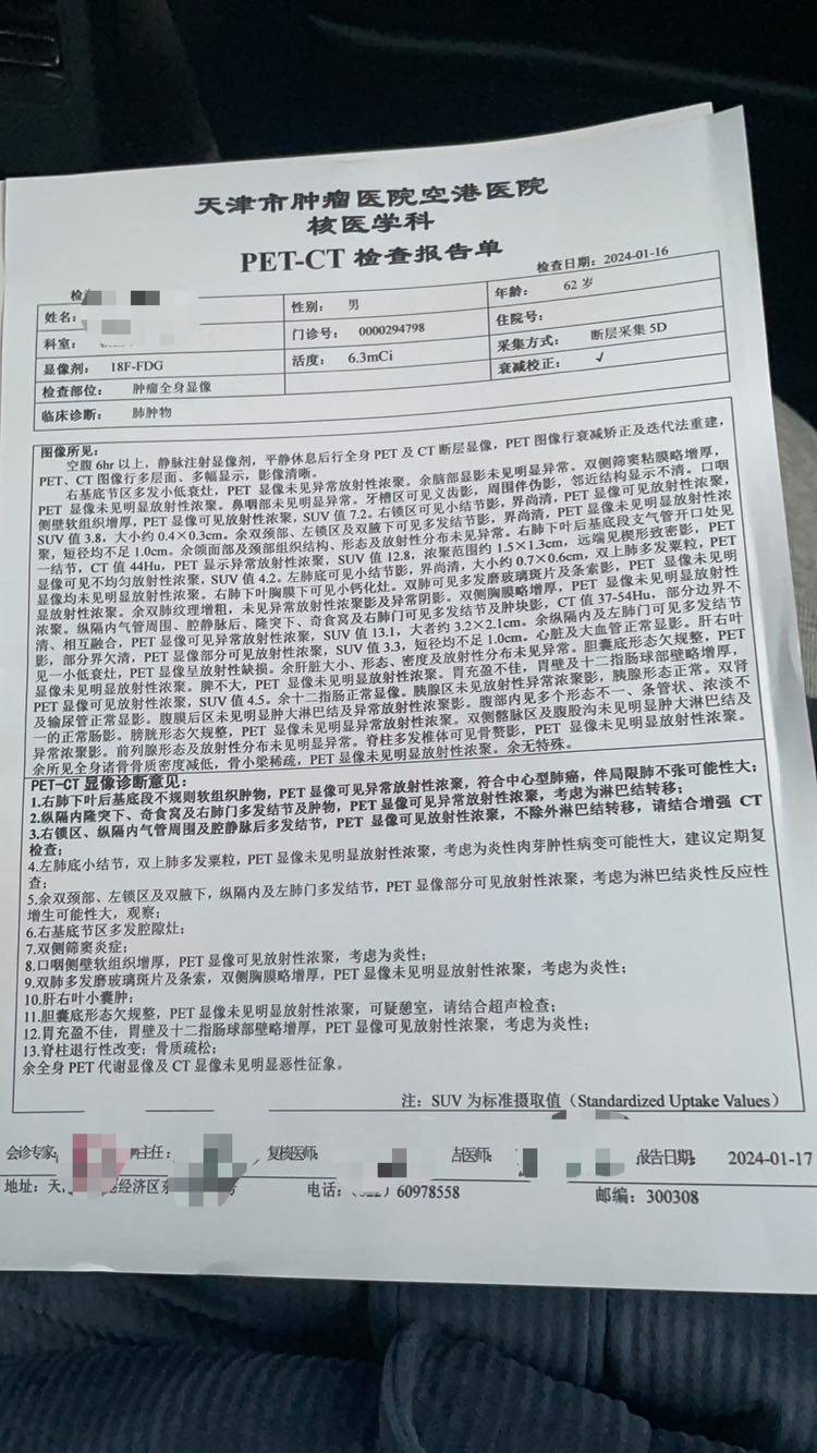 父亲2024年1月12号确诊肺鳞癌,之前做过两次肺部穿刺结果显示炎性,后来支气管镜取到病理组织,肺鳞癌,第七区淋巴结转移,之前在好几个医院拍过CT,也拍了PET CT,对比几家医院的CT,有的医院CT描述父亲肺部右下肿瘤大小6厘米左右,这个6厘米大的肿瘤就是我们穿刺两次都是炎性,当时还以为父亲肿瘤是良性,但中国医学科学院肿瘤医院的CT和PET CT却只显示支气管腔内软组织填充物1.5厘米左右大小,最后支气管镜就是取到这个病理组织的,发现肺鳞癌。基因检测结果父亲没有靶向药,免疫PDL1表达小于1%,还有5个免疫超进展基因,包括MDM2扩增6.5倍,第一次住院治疗时因为基因检测结果还没有出来,治疗方案是免疫联合化疗,紫杉醇 卡柏 帕搏利珠单抗,后来基因结果出来了发现PDL1表达阴性而且超进展基因,咨询医生后建议,第二次治疗时仍然跟第一次一样方案一样,我提心吊胆了几十天,经过两次内科治疗,化疗联合免疫,复查各项指标和CT,惊喜发现治疗有效,父亲争取到手术机会,内科医生说效果好,再治疗两个疗程把转移的淋巴消一下再评估手术。