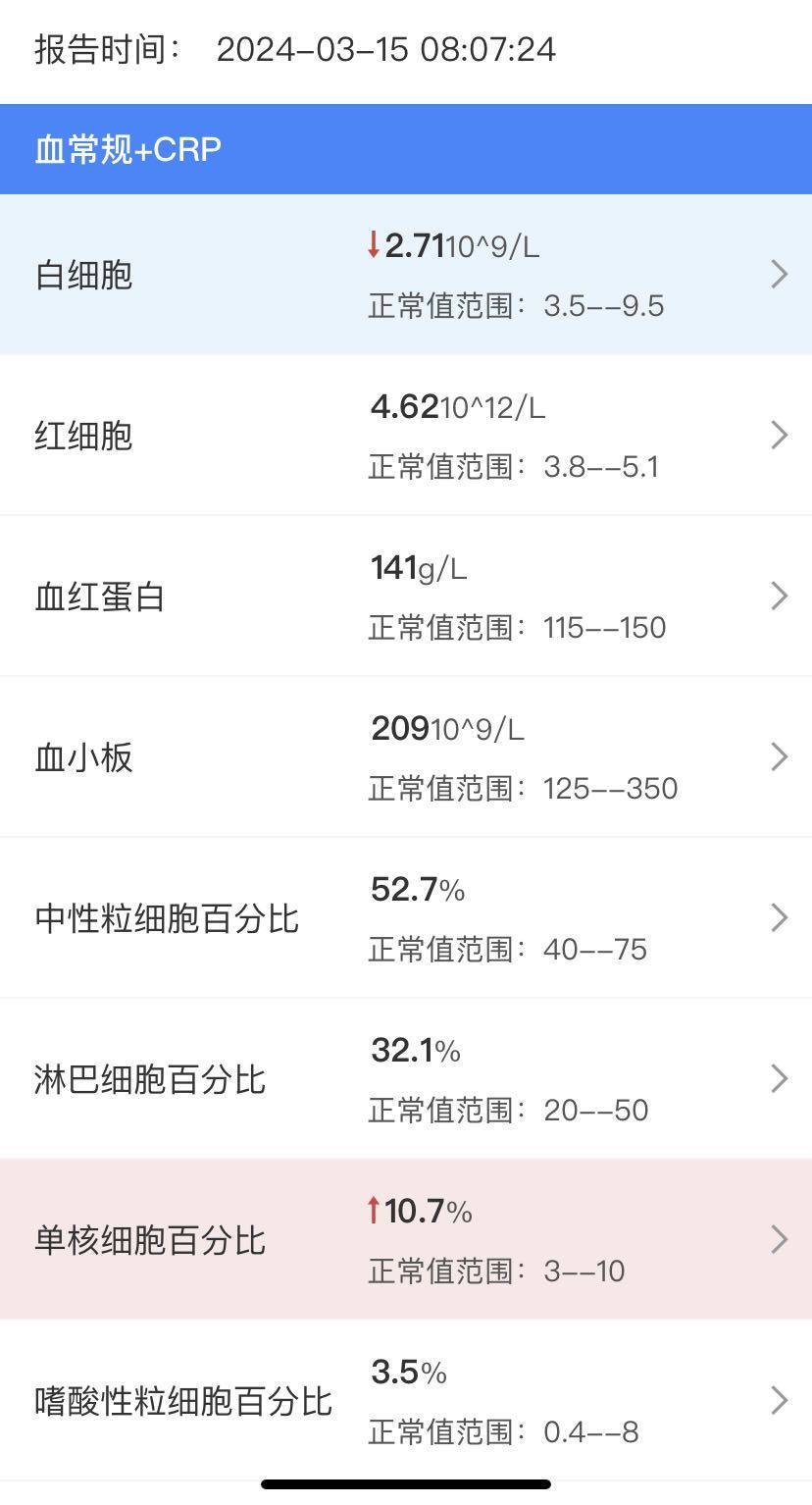 白细胞计数低:白细胞计数低可能是由于多种原因,包括药物副作用、感染或其他疾病。在靶向治疗中,某些药物可能会导致白细胞减少。如果白细胞计数持续低于正常水平,医生可能会建议调整药物剂量、给予白细胞生长因子或其他支持性治疗。请务必与医生讨论这一问题,并遵循医生的建议。