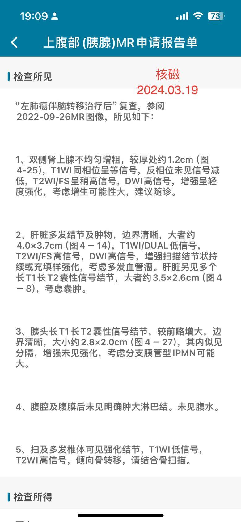接上回复查说主胰管轻微扩张,昨天去拍了胰腺核磁,我拿到报告之后还去检验科骚扰了读片出报告的医生,是一位非常好的女医生,还跟我解释了报告里的每一条,她说检查出来胰头的ipmn 跟2022年的囊肿大小差距不大而且里面没有很多实性成分,而且扩张的程度很小,所以她们根本没在报告里写,继续观察就可以,如果真的是有恶化倾向,他们会在报告里直接写恶化的。跟22年的核磁比,椎骨结节变多了,但是老曲23年初的ct就报过椎骨结节,同步做了骨扫描也没有问题,近期的ct也是一直同前。医生说她们核磁只跟核磁比,不会去阅读ct片子,只是跟22年核磁比较有新增,于是就写了个警惕转移,毕竟过了一年多了,老年人骨质本来就会有些退行性变化,可以先观察,过段时间做个骨扫描。
