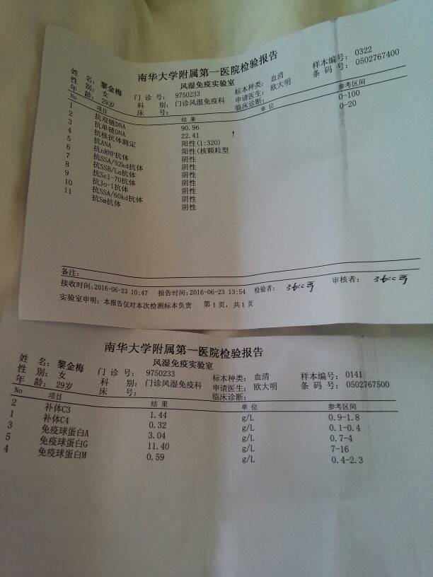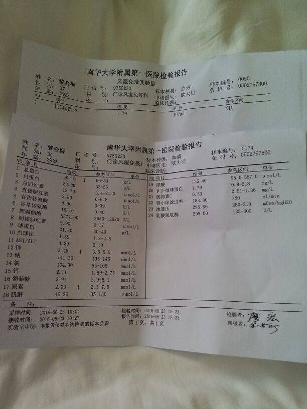 昨天老公让我哥带来了以前我刚确诊病的结果,虽说不会看得懂的公公婆婆,还是很认真的打开一叠,来一张一张的看了起来。今天带来给这里住院的医生看了,本来就在住院的我,前几天还在这医院(附二)做了狼全套检查,因为不放心,今天又要求我去别的医院(附一,我平时看病就是这里)再做一次,上午公公就带着我和哥哥一起去了,挂了个号,到我看的时候我就叫医生帮我说说话,我说这是我公公,他刚刚发现我有这个病,不太了解,怕吓到他了,麻烦你好好说说,让他心里舒服一点。结果,医生就对他说,这个病现在很常见了,发病律很高,也不会传染,不要太担心。然后公公说,这病很难治好吧?医生说能治好,但想治断根就难,因为目前还没方案能治愈,但得这个病的人很多,不止她一个,一天来这看病的都是一样的,如果你不信,你就坐在旁边看看,一天接多少这样的病人,他们一样吃药,依然活得很好!说完医生就让我去化验血了,也顺便给了微信号我,说结果出来了,不用跑来医院了,可以微信好大夫在线资讯。好希望今天医生的话能帮到我,让公公心里舒服一点,希望能慢慢来接受我的这个病(结果下午三点半全出来了,是公公去取回来医院给我的)好想知道他心里在想什么啊?