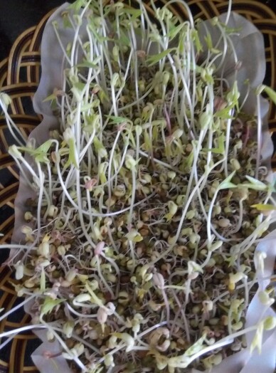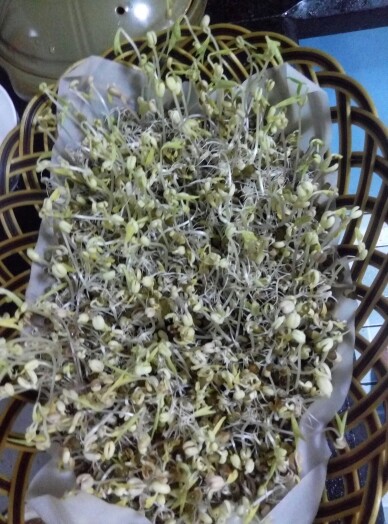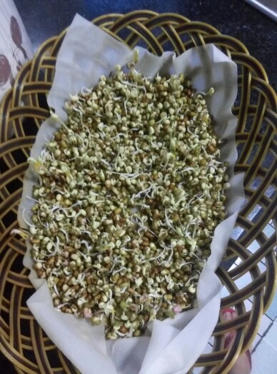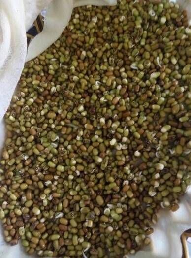 先泡一晚上,绿豆上面要盖块纱布,再用黑袋子套上不要见光,每天浇两到三次水,四天就OK了