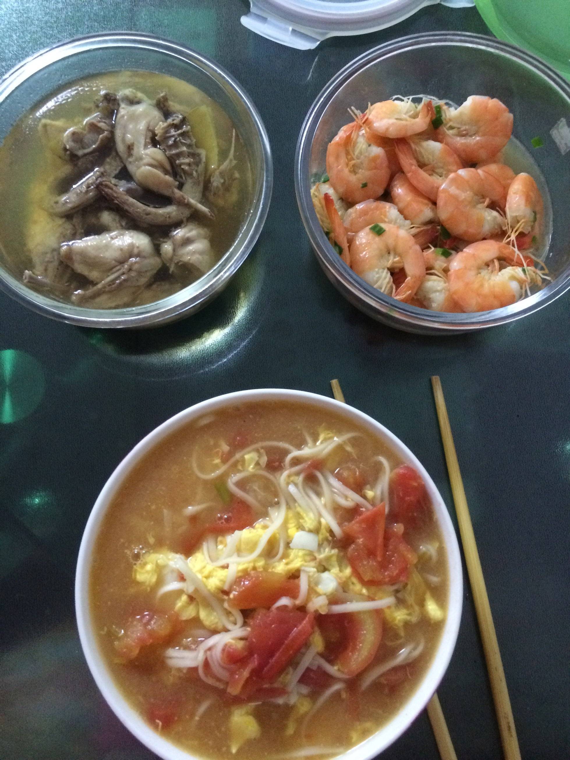 鹌鹑鸟清蒸,基围虾,西红柿鸭蛋面