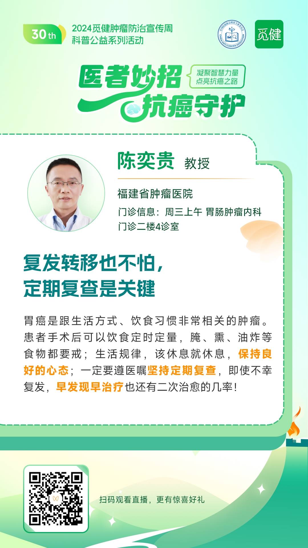 肿瘤防治周期间,觅健携手 福建省肿瘤医院胃肠肿瘤内科陈奕贵教授 围绕“胃癌不是终点,专家揭秘长生存患者抗癌秘诀”,给胃癌觅友们带来了精彩的医者妙招,让许多患者受益匪浅。