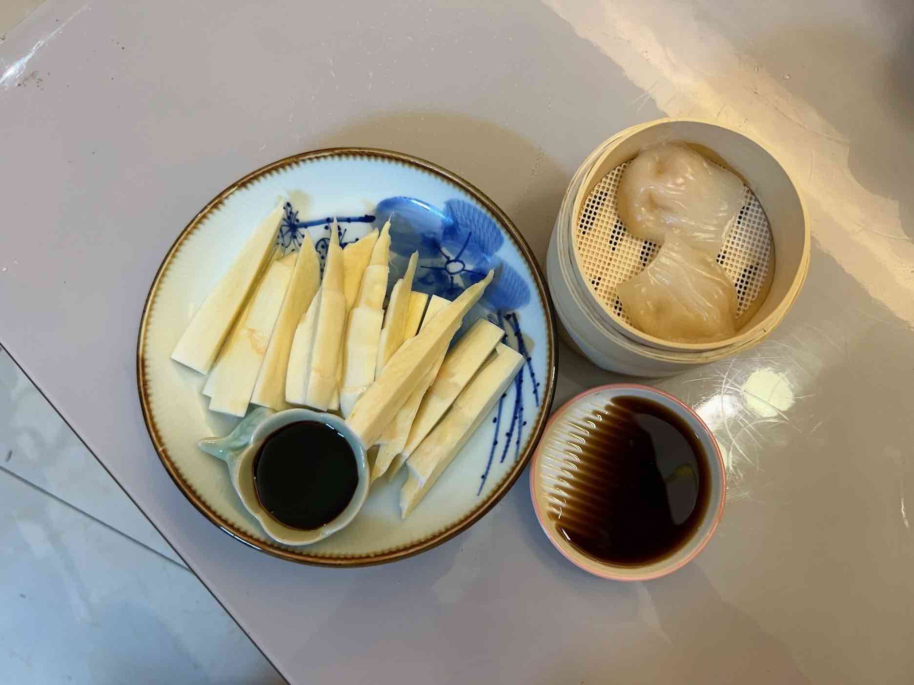 蒸了三根茭白,两个广东虾饺当午餐。