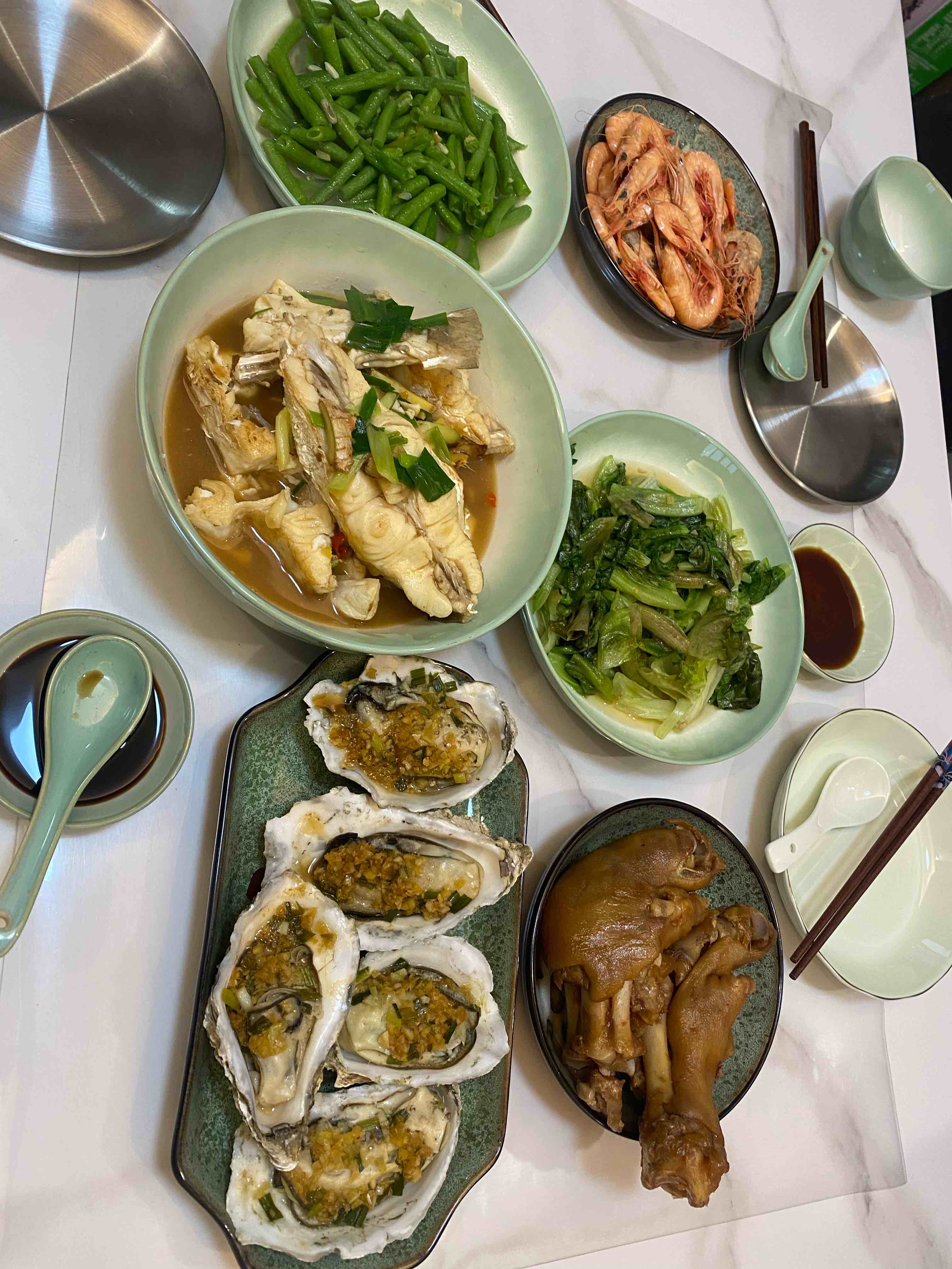 今天的晚餐太丰盛了,有生蠔、鱼、虾和猪蹄。尽管都很好吃,我还是比较自律,猪蹄几乎没碰。
