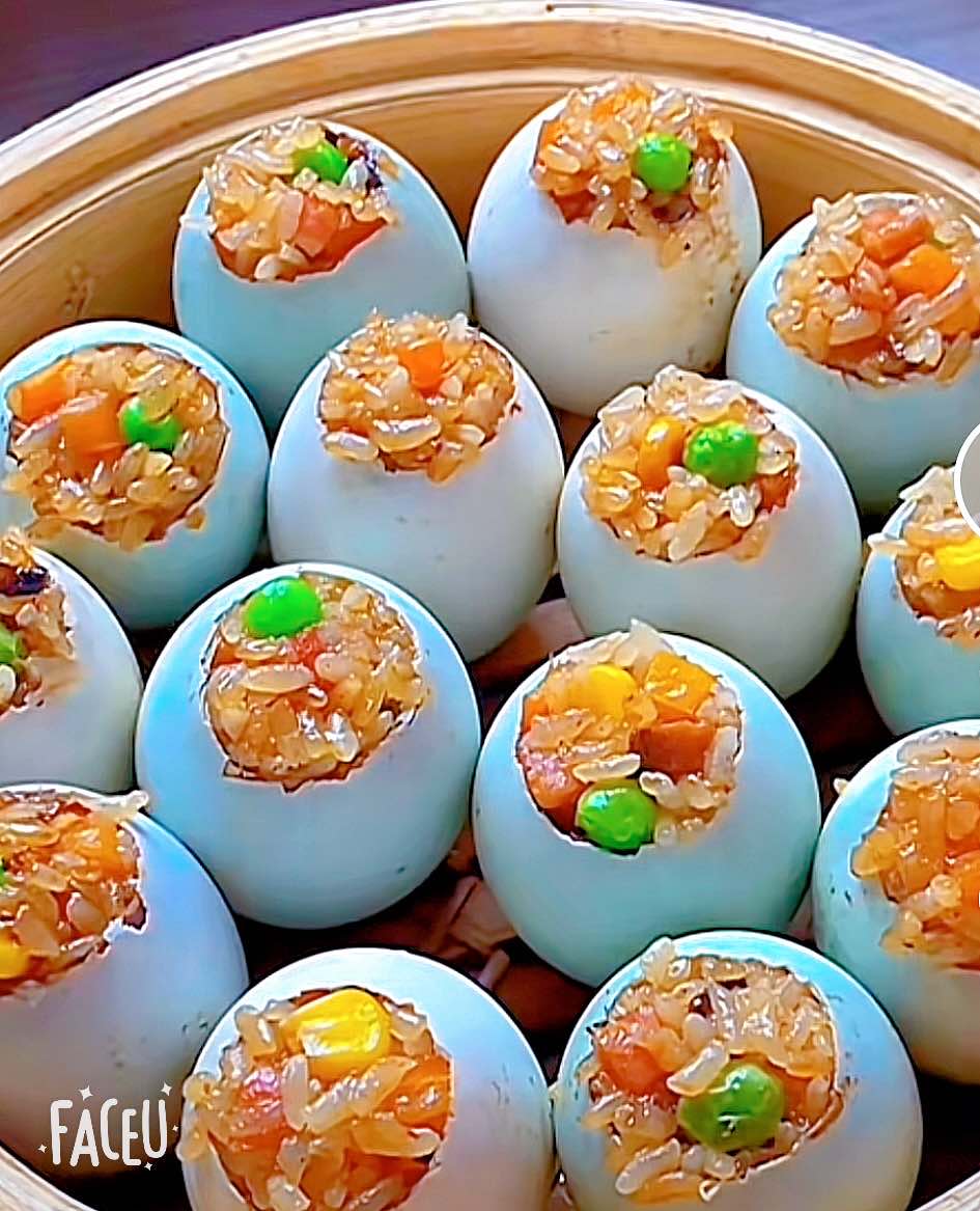 糯米蛋把生鸭蛋头部敲一个洞把蛋清倒出只留蛋黄。糯米提前泡一晚上,加豌豆、胡萝卜碎、香菇丁、玉米粒、腊肠丁,生抽、老抽、蚝油、食用油、少许胡椒粉、所有食材搅拌均匀。用小勺装到蛋壳里,最后上锅蒸熟即可。(所以食材调料按照自己口味来)
