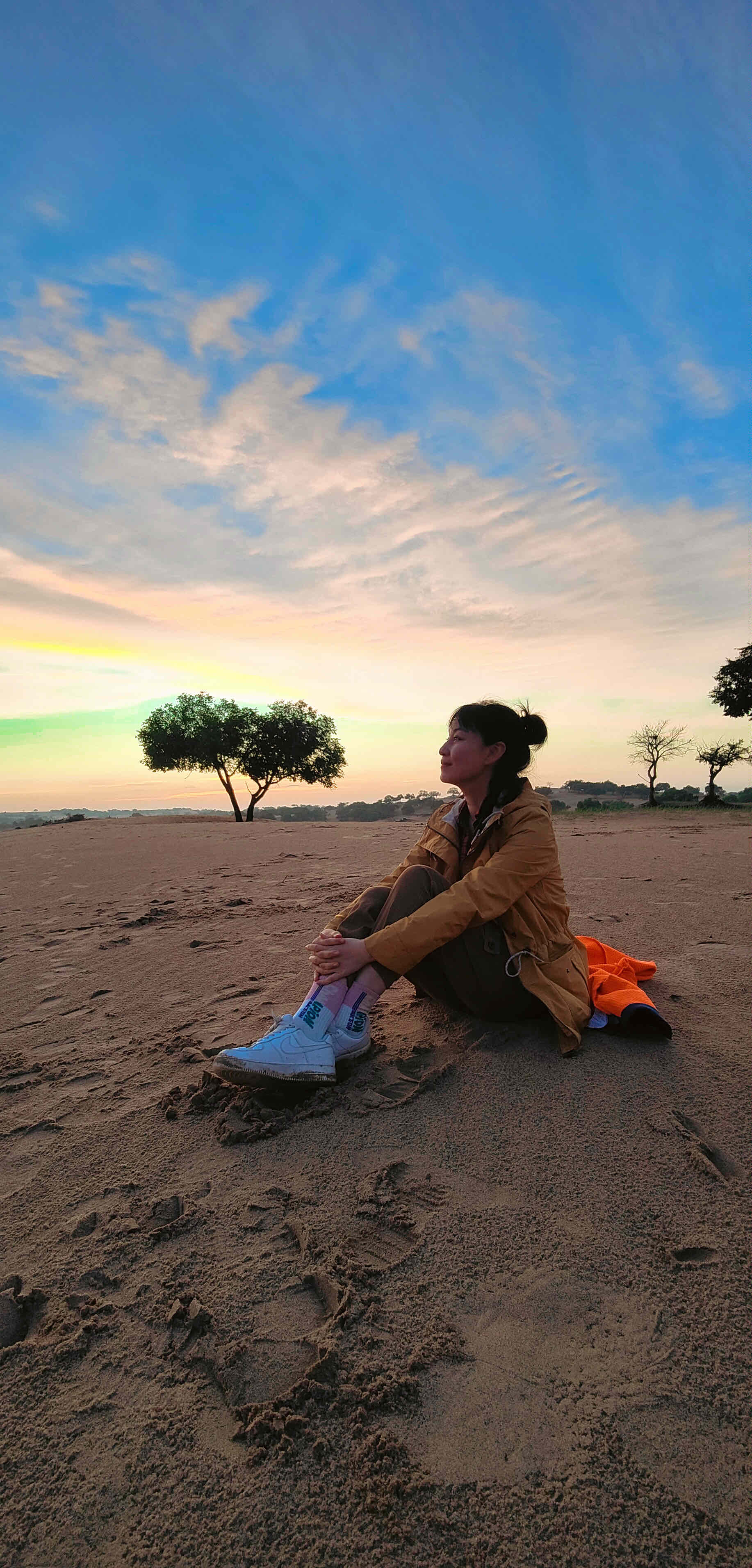 我又去了上次视频里被鸟儿吓一跳的地方,找到我最喜欢的那两棵树,躺在沙地上,看着视野所能及的铺满苍穹满天的彩霞,那一刻的美丽和宁静,真的无法形容!