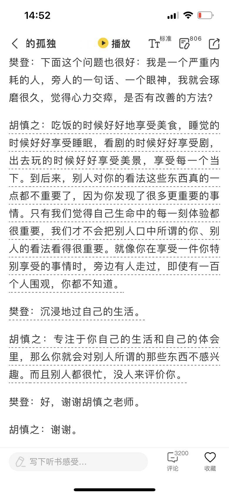 触动我的是快问快答最后一个问题老师的答复,好好吃饭,好好睡觉,沉浸在自己的生活中,自然不会在意别人的看法!