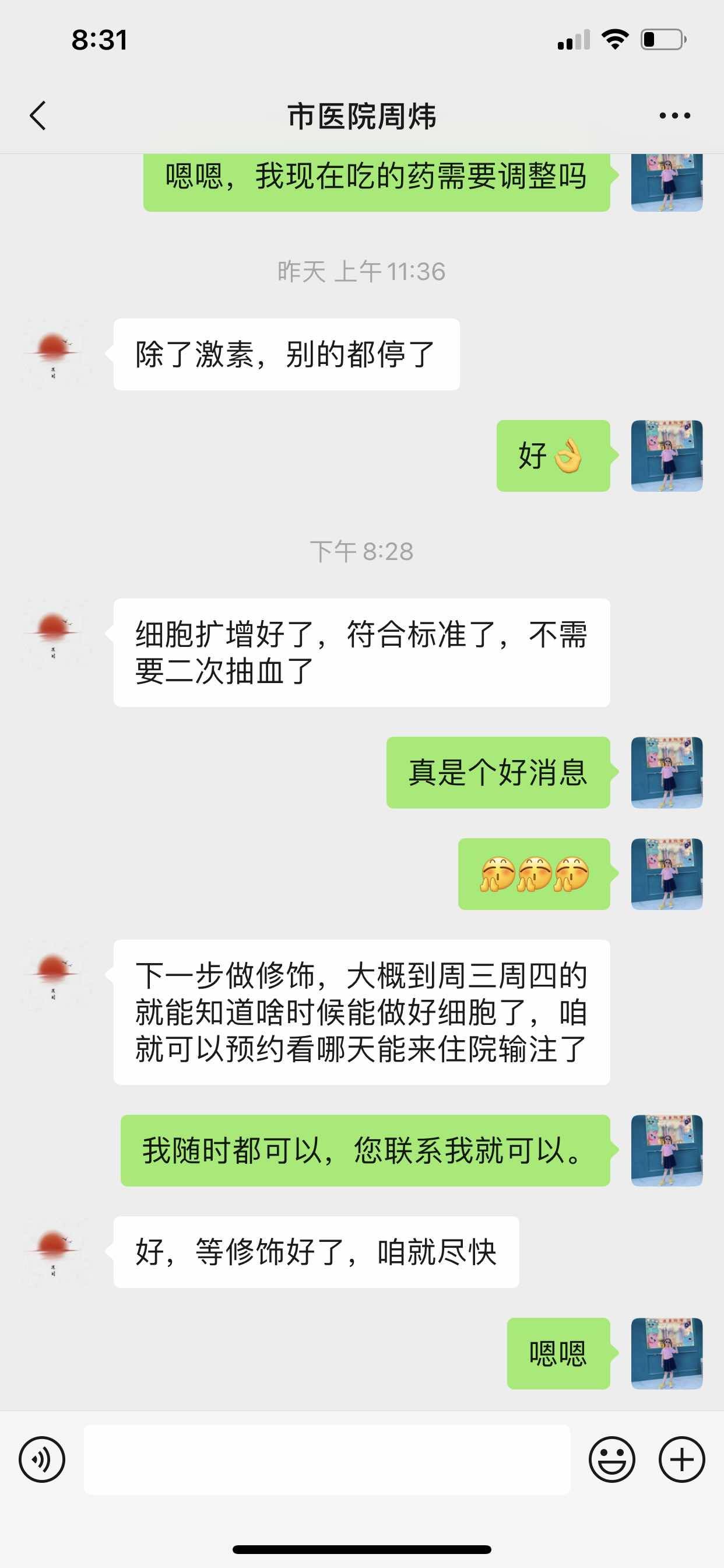 今天晚上收到大夫微信,细胞采集量够了,不需要重新采集了,好开心啊,真是好消息!
