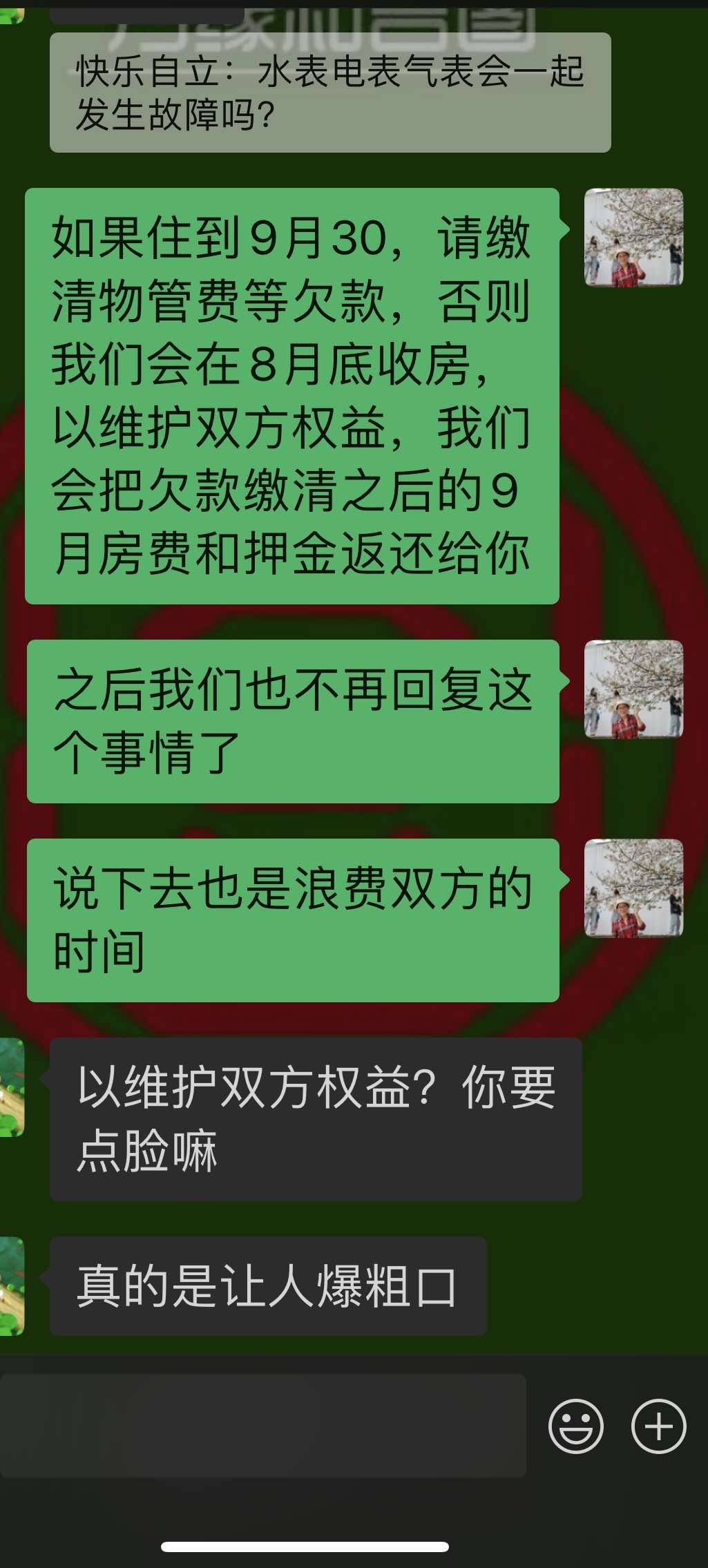 原租房合同9月底到期,因为她已有4个月的物管费和上个月的电费都没支付,算单方违约,我儿子代表我通知她这个月底提前解除合同,月底我们去收房。估计真有一顿架要吵,儿子说要不是提前回校,他真想陪我去重庆处理这件事,让同学来帮我吵架。