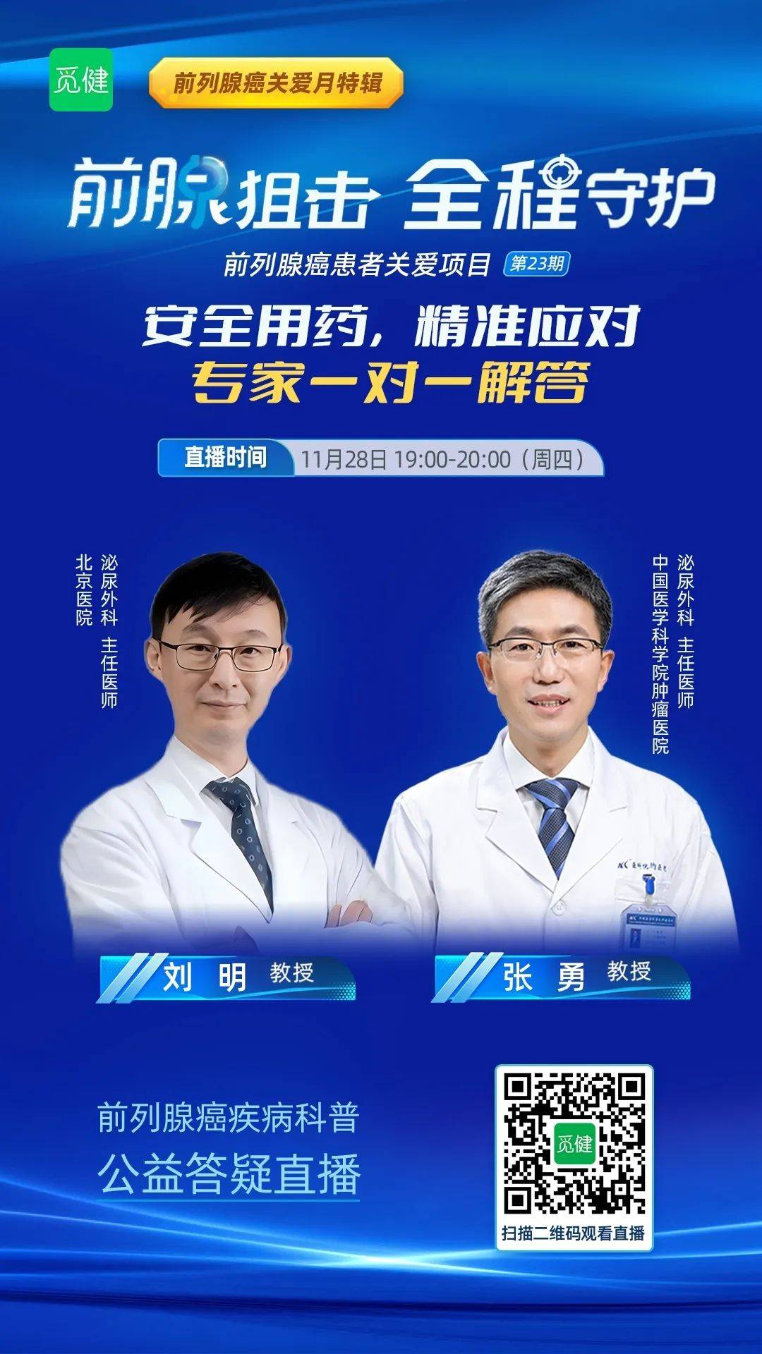 觅健特别邀请到 北京医院泌尿外科主任医师 刘明教授 和 中国医学科学院肿瘤医院泌尿外科主任医师 张勇教授 于2024年11月28日(周四)19: 00-20:00,为觅友们开展主题为【安全用药,精准应对,专家一对一解答】的线上直播。