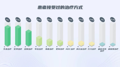 在本次调查的晚期三阴性乳腺癌患者群体中,化疗仍占据主导地位。治疗过程中常见的不良反应,如恶心、呕吐、脱发、疲劳等,不仅严重影响患者的生存质量,还成为影响治疗依从性的重要因素,近七成患者因不良反应萌生放弃治疗的念头。相比之下,尽管免疫治疗、靶向治疗及抗体偶联药物(ADC)治疗等创新疗法展现出一定的治疗潜力,但在实际应用的普及上还有很大的提升空间。