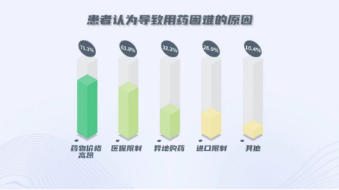 - 患者药物获取困难的因素主要是药物价格高昂、医保限制、购药不便
