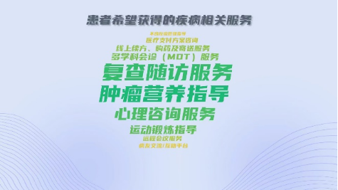 - 患者最希望获得的相关服务前三为肿瘤营养指导、复查随访服务、心理咨询服务