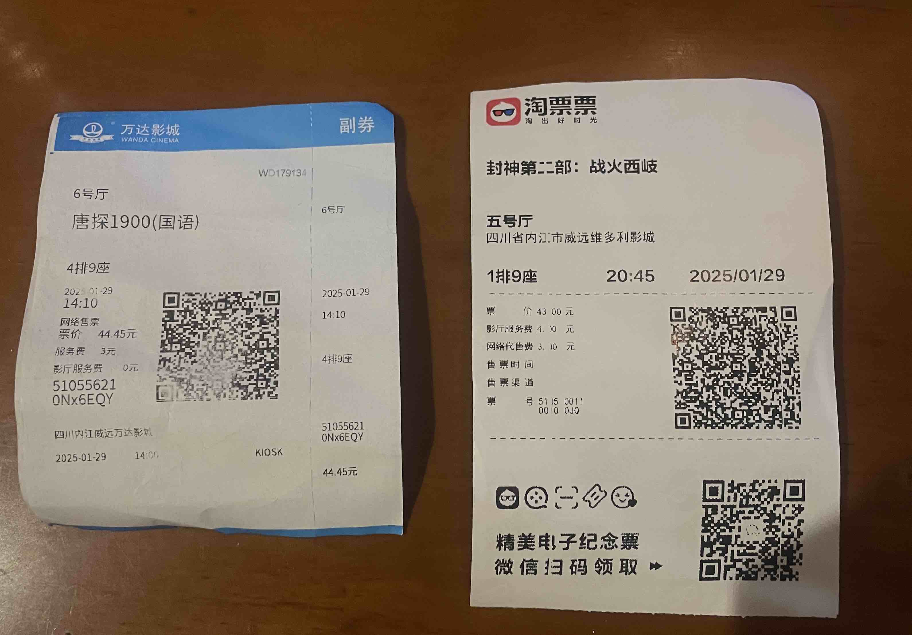 然后今天差不多都是在电影院里过去的。下午和儿子一起去看万达影城《唐探1900》晚上又和朋友一起去看《封神2》。不过这电影看得并不简单,接了好几个电话,有民宿需要处理的事情,也有我老爸打给我的。民宿的联系我尽量用微信文字,我爸的电话我也压低声音生怕打扰到别人,说了我在看电影,我爸还是不识趣,给我打了好几个。