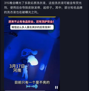 举个例子,觅友们担心的荧光增白剂问题,如果成分表中出现“荧光增白剂”、“FWA”等字样,那么这款洗衣液就很可能含有荧光增白剂。此外,还可以将洗衣液倒在白色的纸张上,在黑暗的环境中用紫外线灯照射,如果纸张发出蓝色或蓝紫色的荧光,那么这款洗衣液很可能含有荧光增白剂。