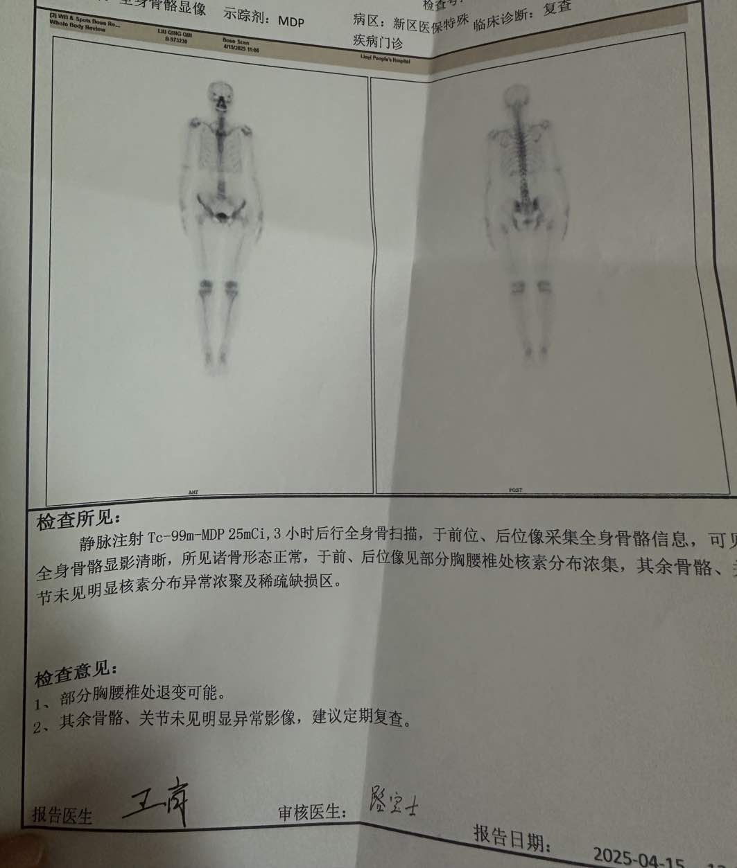 术后复查,直接报了胸腰椎退行病变可能,请问还需要在做一遍核磁确认吗,胸腹部ct也做了没有报骨的问题,请问骨转的病友胸腰椎这个地方的报告提示啥呢?