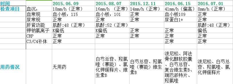 医生每次给我开药都是半个月的~吃完我就没吃了~也没去检查~开始都很好的~就是今年隔了半年2015.12.11~2016.6.15,这半年压力大~心情不太好,经常熬夜了,上次去检查有了一个尿蛋白,血沉41其他还正常~医生让我吃强的松2粒每天,中间我吃了一个星期改成一粒了~然后2016.7.1去检查,所有的又很正常了蛋白也是阴了~血沉为8mm/h~我是去年六月因为关节痛去医院检查的~医生说有这个病的倾向~那时都没有吃药~八月去复查医生让我吃点白芍总苷和羟氯喹~不过我夏天出汗多钾离子就会稍微偏低个0.0几~我就想问大家~我还有必要吃强的松吗?以前因为检查都稳定一直都没有吃~