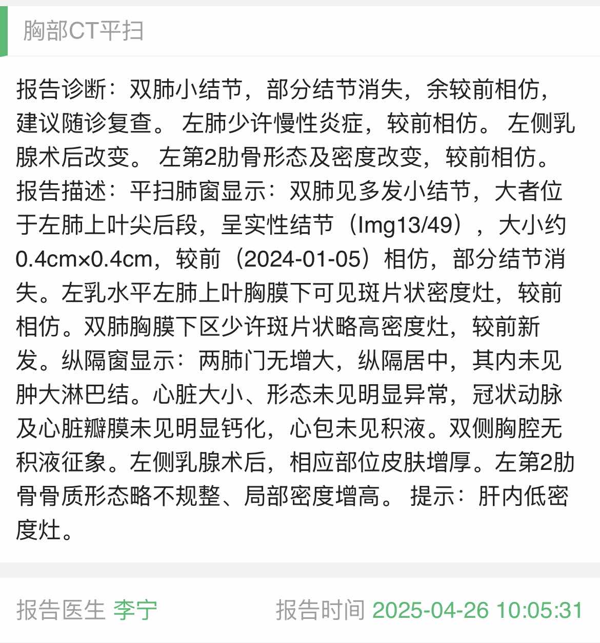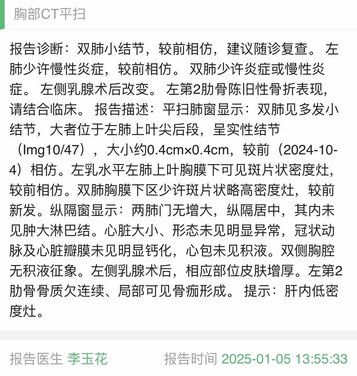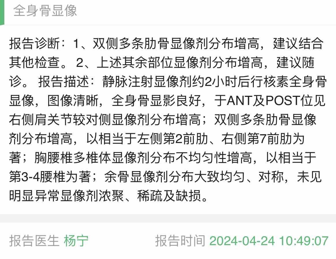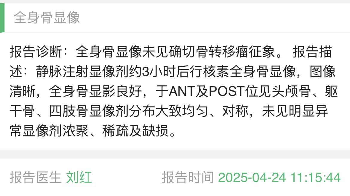 手术三年半,口服达尔西利联合氟维斯群两年了,期间一直是三个月复查一次,上周三在我们当地医院肿内让主任给开了骨扫,本打算五一放假去检查,唯独骨扫节假日休息不检查,只好提前了,说实话也是有点紧张的,周四检查完下午3点出结果了,老公说他去拿结果也有点小紧张😄,下班回家看到结果完全出乎我的意料啊,居然一切正常💪💪💪。