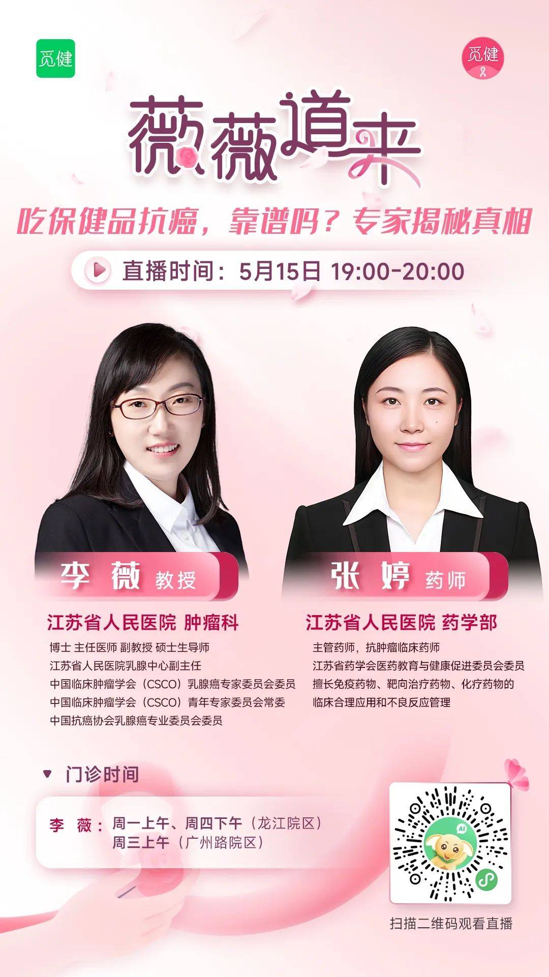 我们下一期【薇薇道来】直播将在明天(5月15日)晚上7点准时开启,主题是“吃保健品抗癌,靠谱吗?专家揭秘真相”,不仅有我们熟悉的江苏省人民医院的李薇教授,还邀请了江苏省人民医院药学部的张婷药师 。