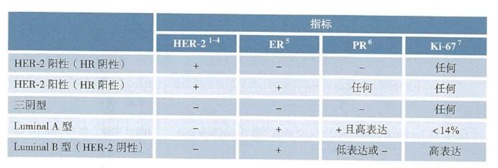 那我们去看自己是哪个分型的呢?主要看这四个指标:ER、PR、HER2、Ki67。