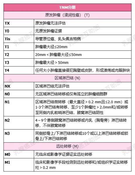 分期也决定了乳腺癌治疗的主要目标和整体治疗方案。分期是根据原发肿瘤大小(T)、区域淋巴结转移情况及数目(N)及是否存在远处转移(M)这三个指标来确定的,称为TNM分期。