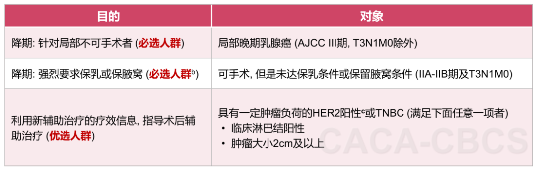 图1 新辅助治疗的目的和对象(图源:《2025 CACA乳腺癌诊治指南》)