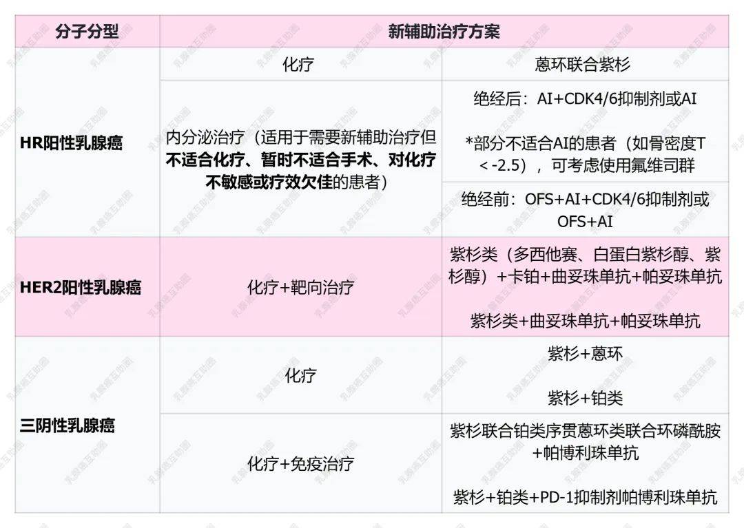 根据不同的分子分型,新辅助治疗方案也不同[2]: