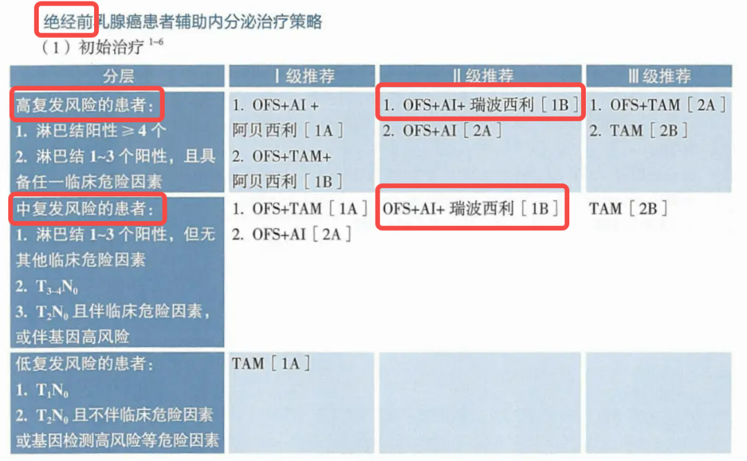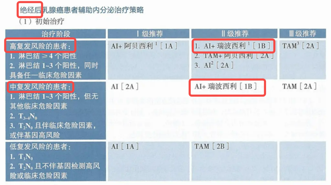 无论是绝经前还是绝经后,《2025 CSCO乳腺癌诊疗指南》将AI+瑞波西利列为中、高复发风险患者的早期强化辅助用药的II级推荐[4]。