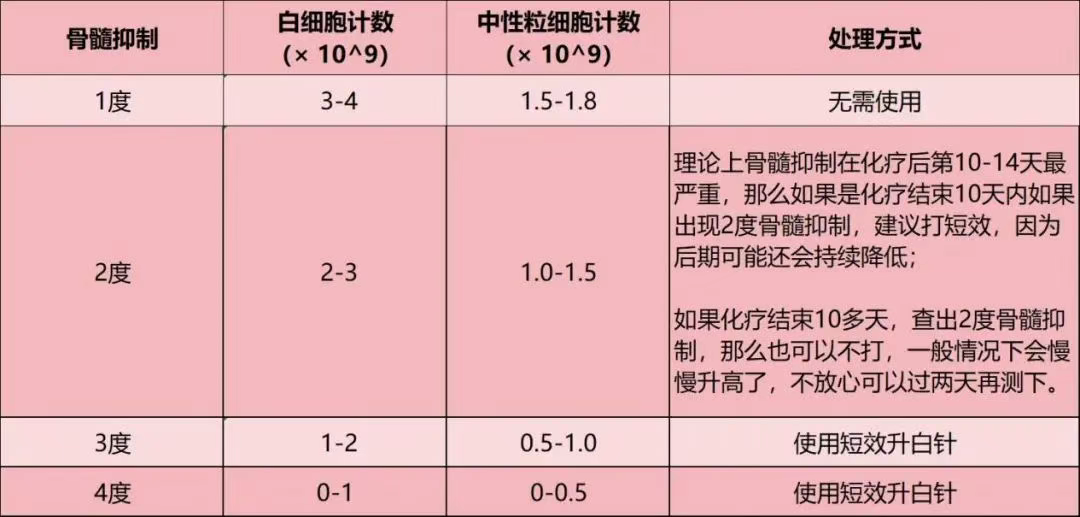 面对骨髓抑制,需要根据其严重程度逐步升级处理。如果只是1度骨髓抑制,一般不需要打升白针,可以选择升白药物(如芪胶升白胶囊、利可君等);2度骨髓抑制需要综合各项指标情况,预测后期进展,再决定是否打升白针;3度和4度骨髓抑制需要打升白针并调整瑞波西利的剂量。