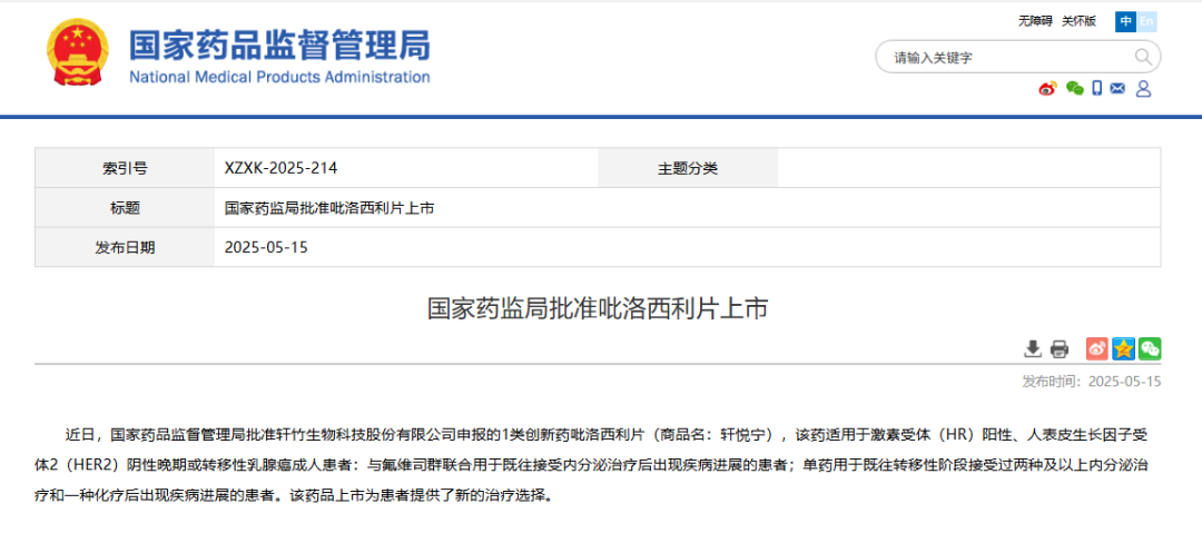 乳腺癌药物资讯:2025年5月15日,国家药监局官网显示吡洛西利片(商品名:轩悦宁)已批准用于治疗HR阳性、HER2阴性晚期或转移性乳腺癌成人患者。该药可与氟维司群联合适用于既往内分泌治疗后进展者,或单药用于接受过两种以上内分泌治疗和一种化疗后疾病进展的患者。相关文章《这个乳腺癌新药好牛,内分泌治疗失败、内脏转移也不怕!她已经很久没有疾病进展了……》